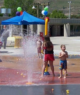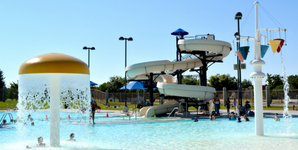 Interactive spray-and-play water features for a free and fun way to cool off during the summer.